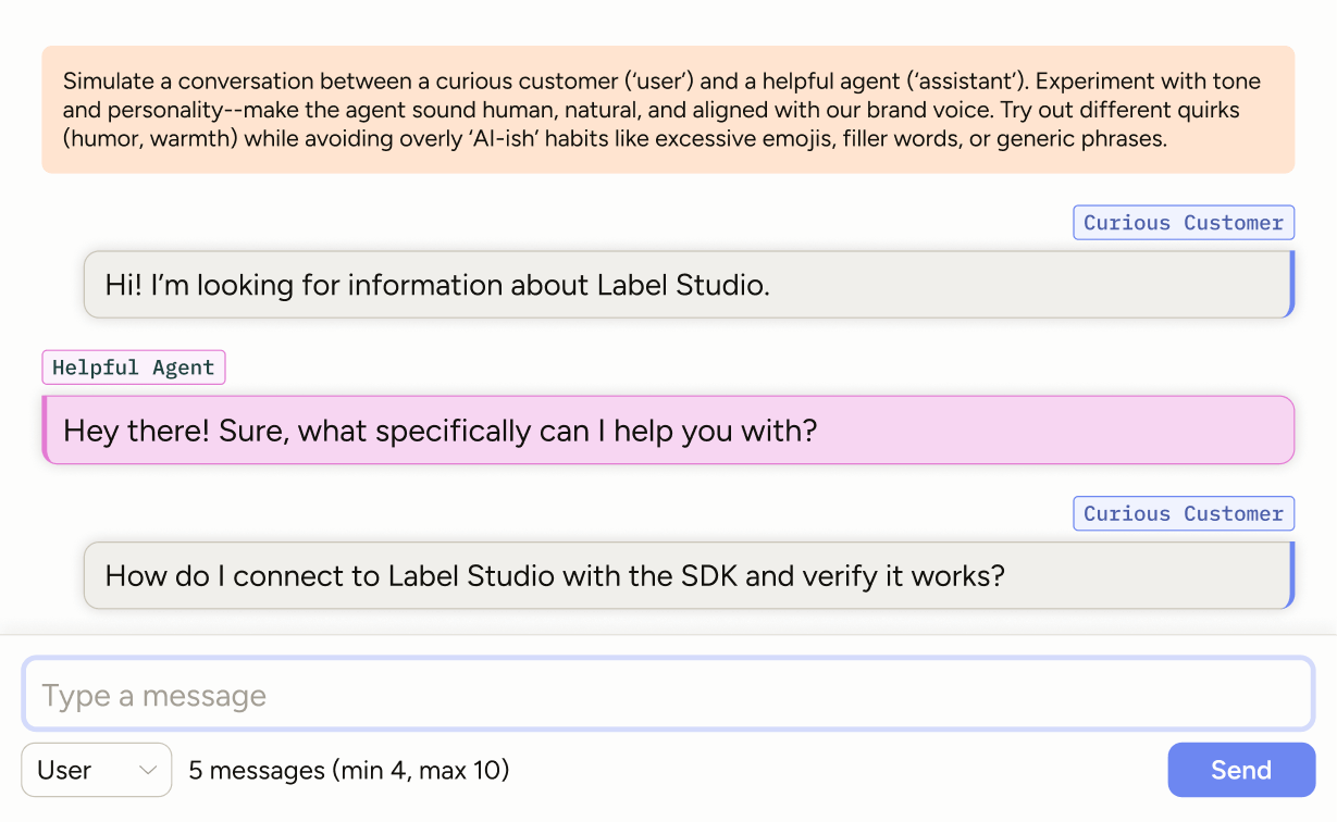 Simulate multi‑turn chats by playing both user and assistant (or pair with a teammate). Capture tone, style, and persona for fine‑tuning—using human‑written dialogs to avoid the generic “frontier chatbot” voice.
