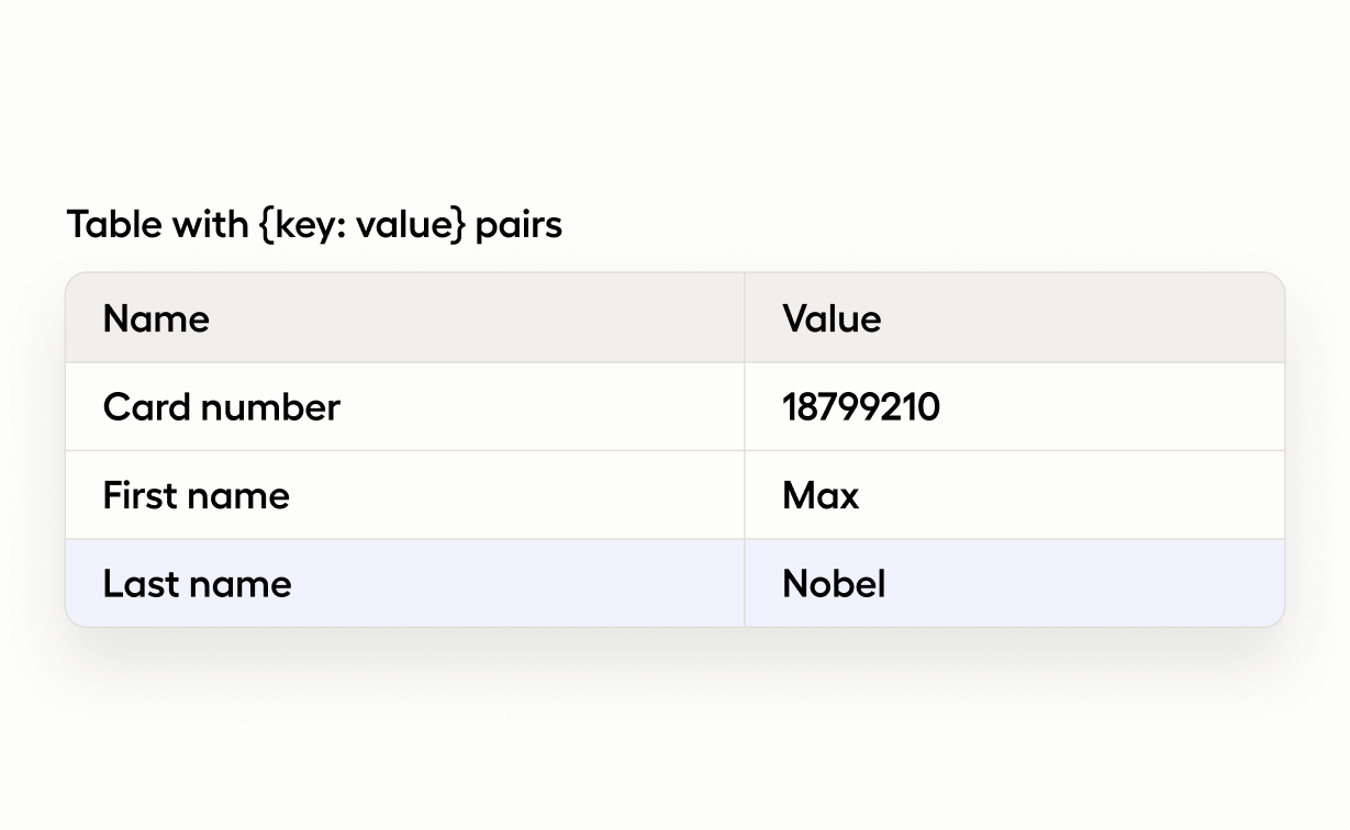<Header value="Table with {key: value} pairs"/>