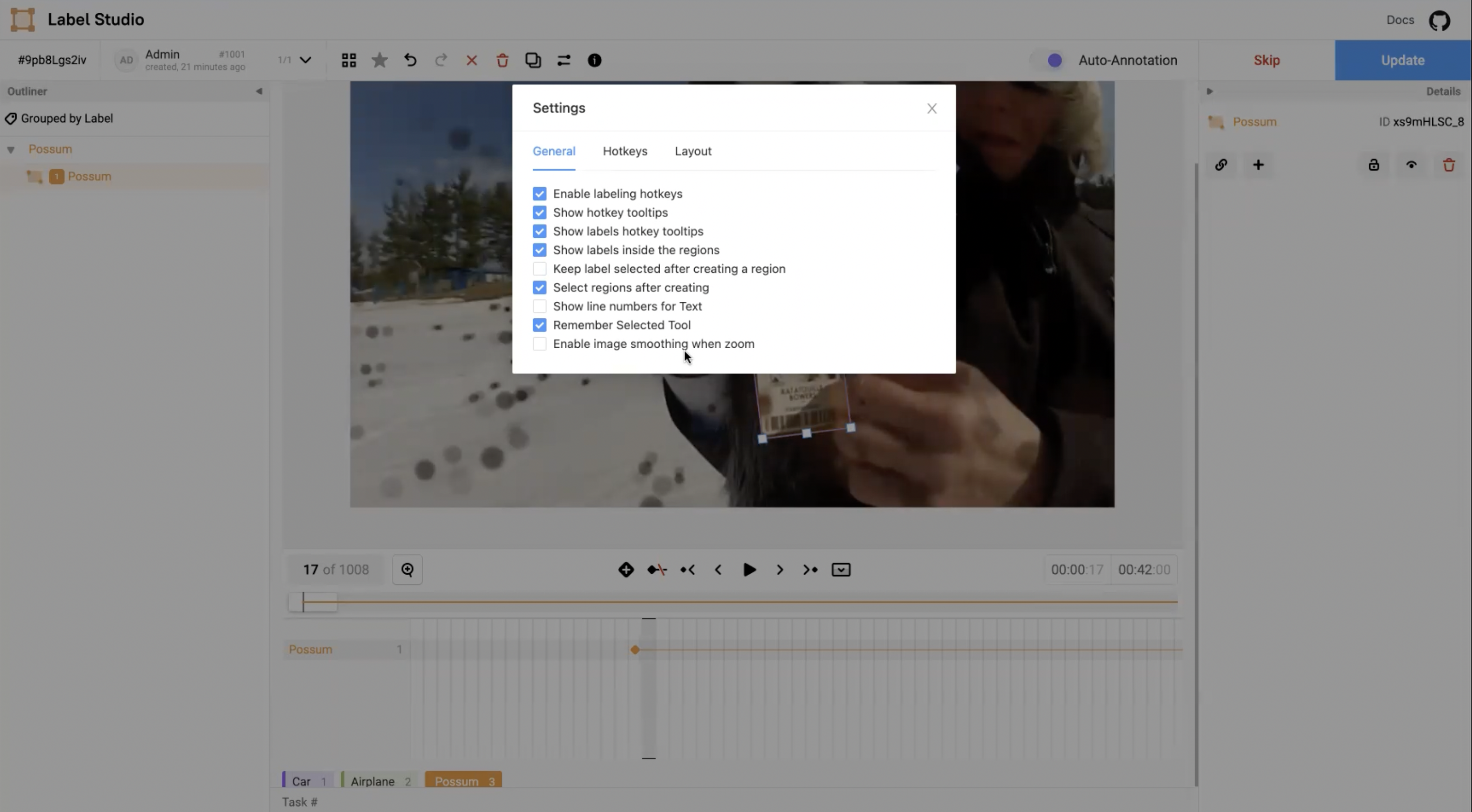 You can reconfigure the annotation workspaces to simplify labeling larger tasks, including large images and longer videos with many regions. This allows you to view more of the video portion, a wider space for the timeline, and the ability to see many keyframes and regions.